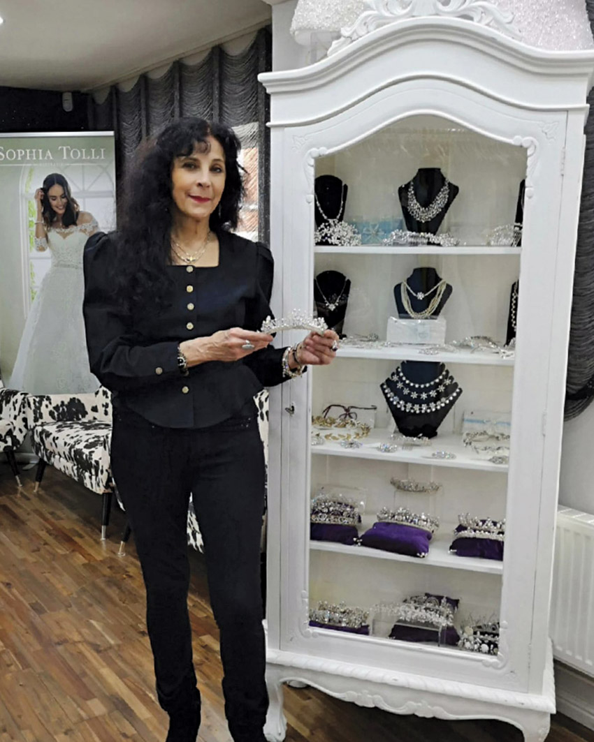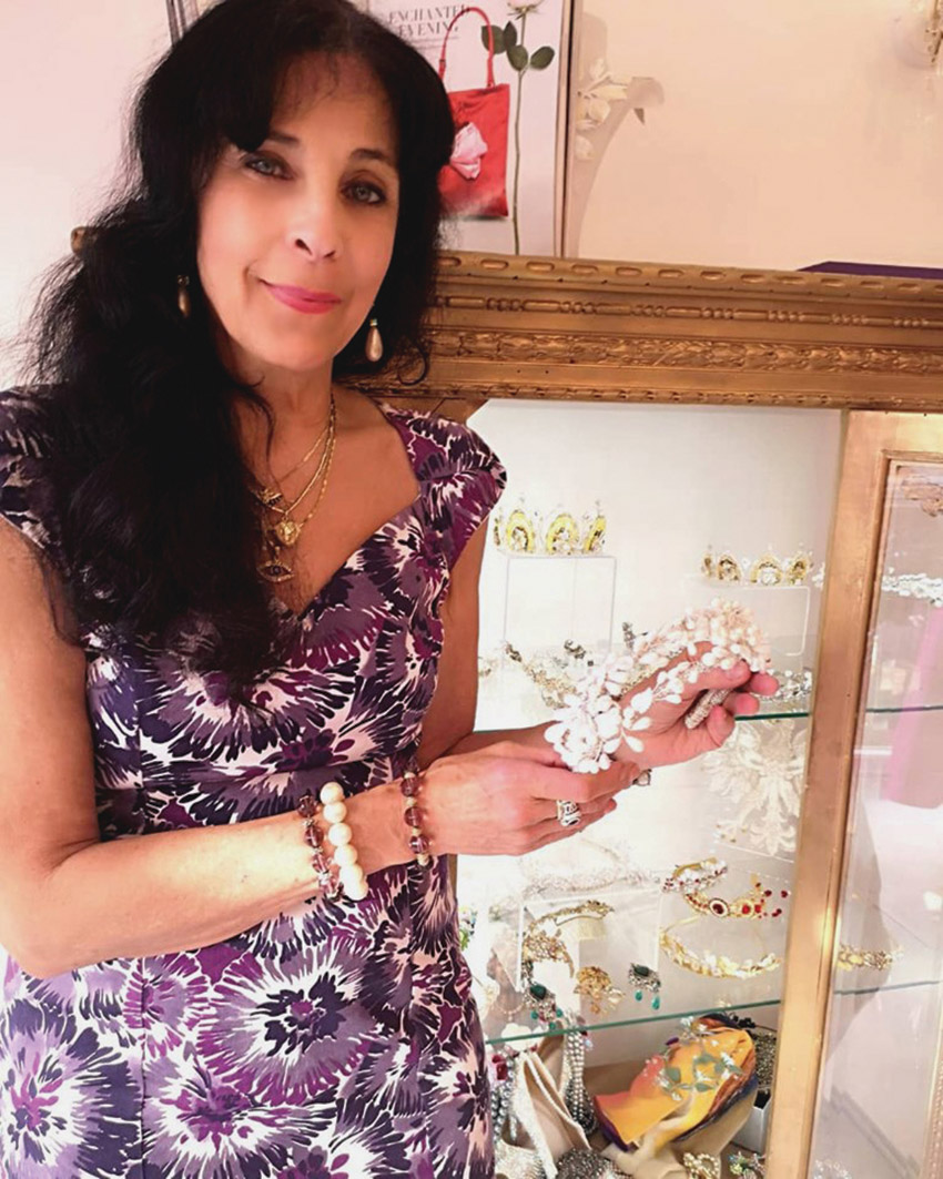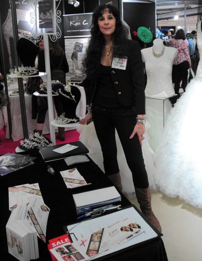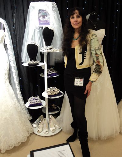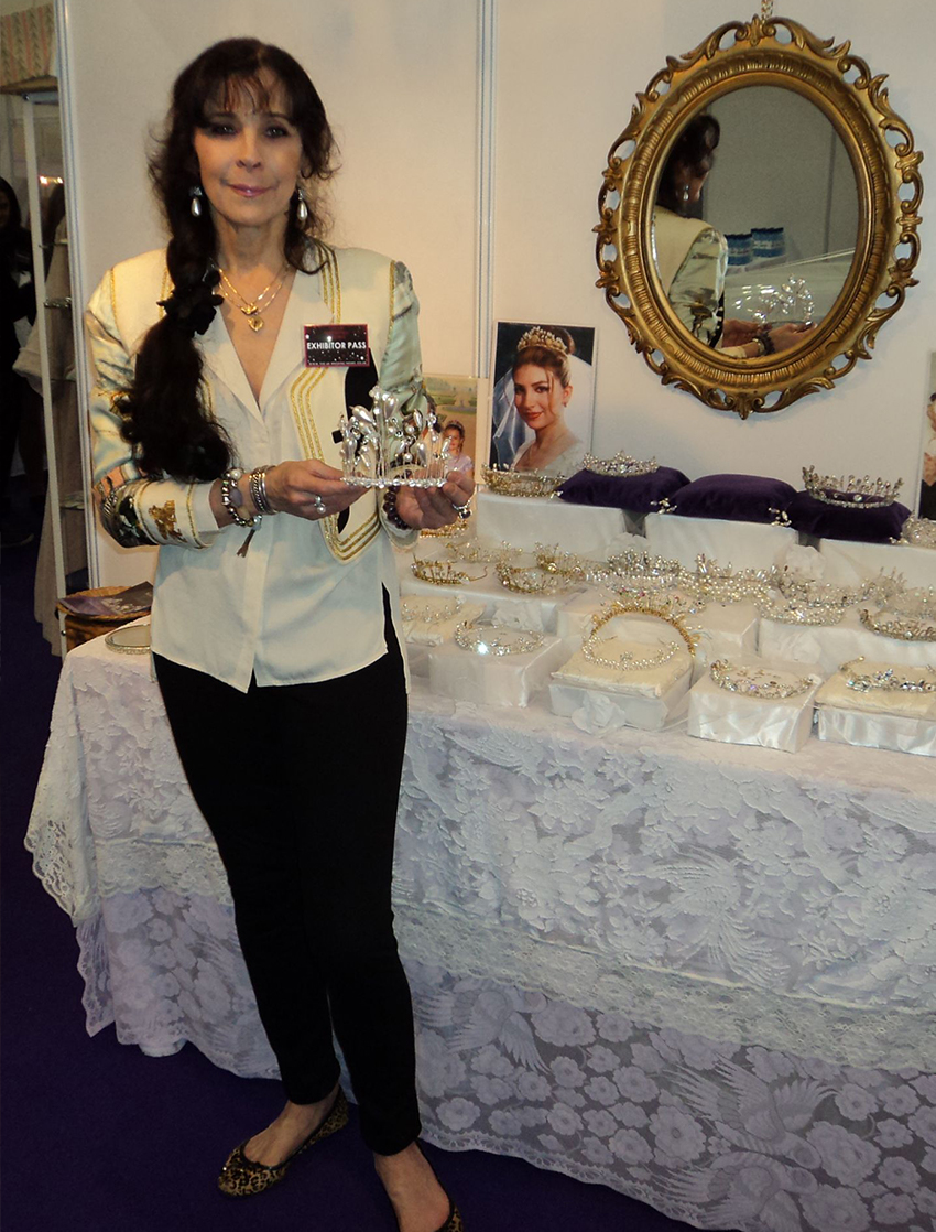 At Kruszynska Couture in front of the Tiara Case, it is a dream to make tiaras for the beautiful gowns.