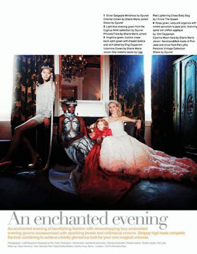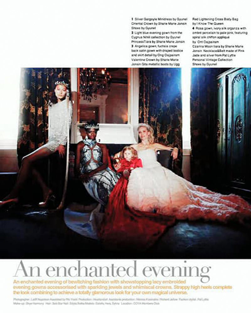 Sharie-Marie Tiaras have been featured in wedding magazines, fashion shows, and pret a porter fashion magazines. She has made tiaras for the designers Adebayo Jones and Kosiba Fashions, her clients include Sally Farmiloe, Kofu Obasanjo, and Miss World.