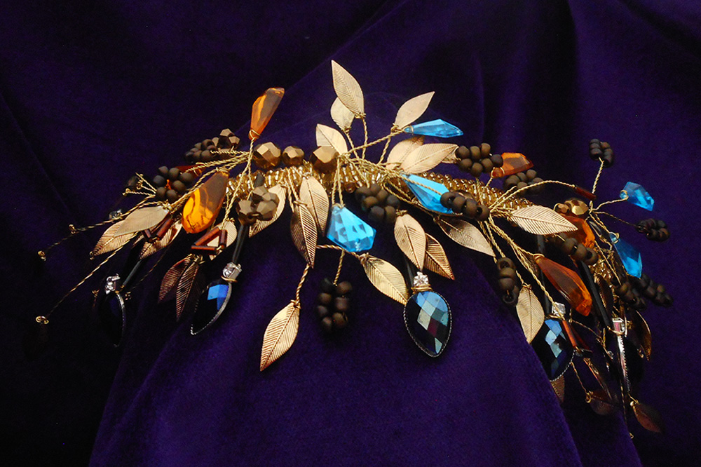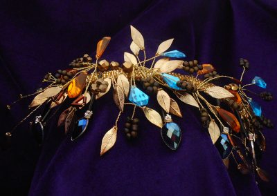 Gold leaves, with multi coloured diamante stones, in dramatic bursts of organic leaf shapes.