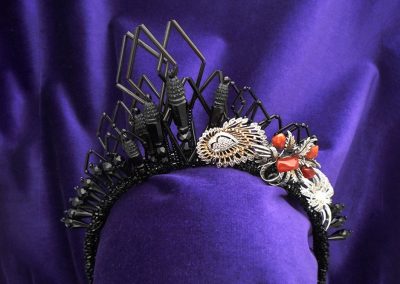 Black jet beads woven in dramatic peaks, framed by silver carnelian brooche, vintage black jet beads woven around crown.
