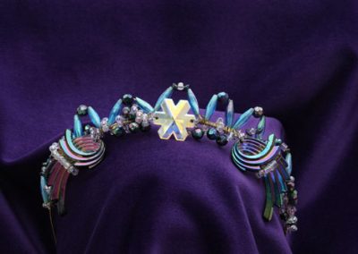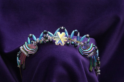 Aurora Borealis swirls woven with abalone colored beads, crystal stars, lilac seed beads in mermaid crown.