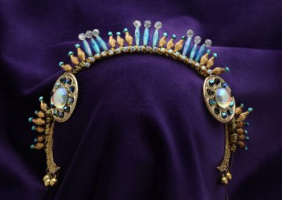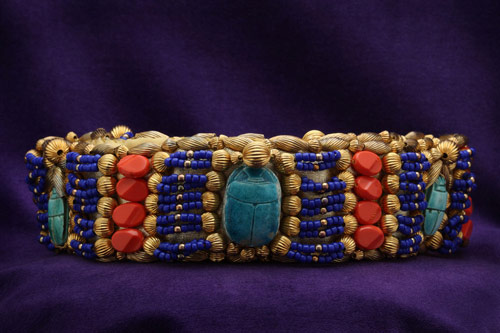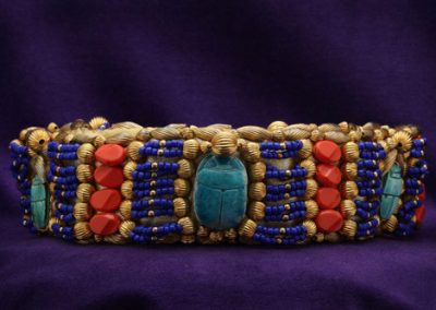 Pharonic Egyptian beaded headband, in traditional colors of lapus lazuli, carnelian, gold brushed beads, with blue faiance scarab beads from Egypt.
