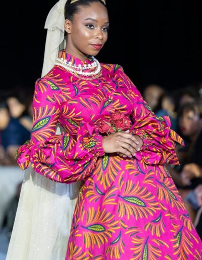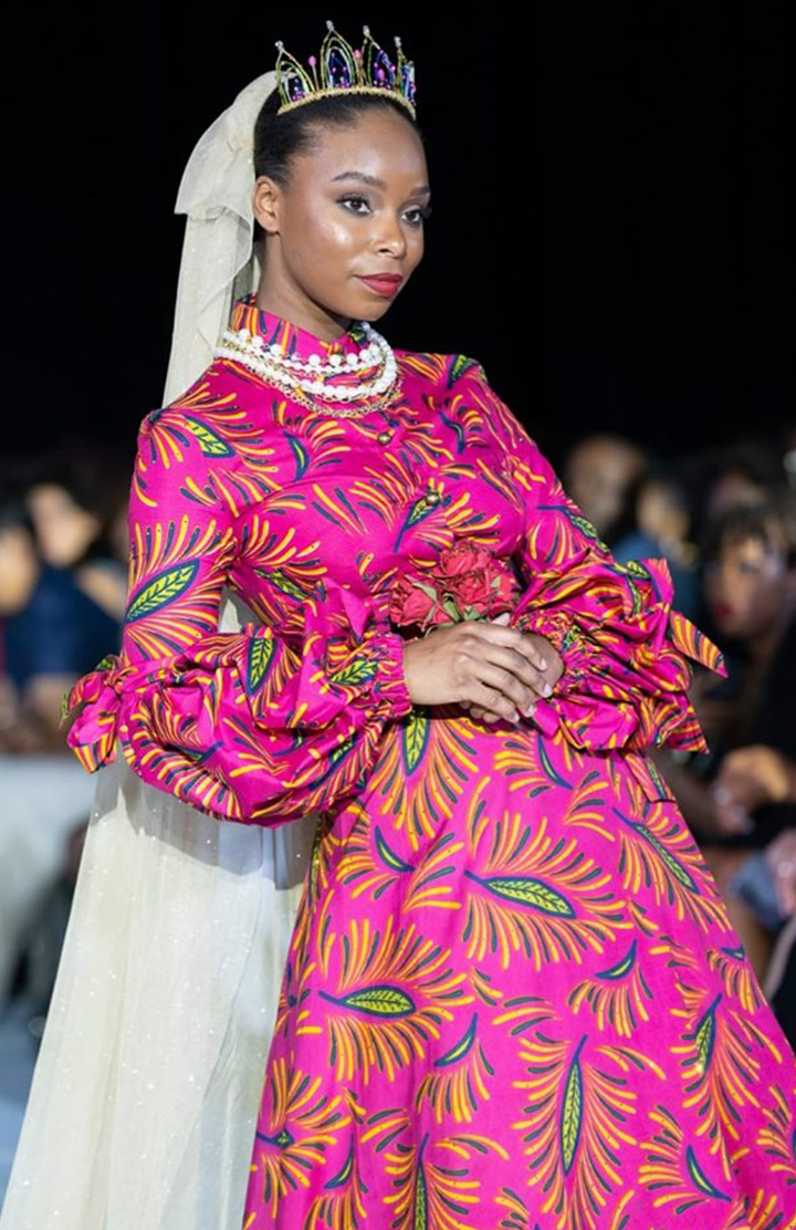 Pink beads, coloured sequins, and bugle beads shaped into peaks for colour burst for the African prints.